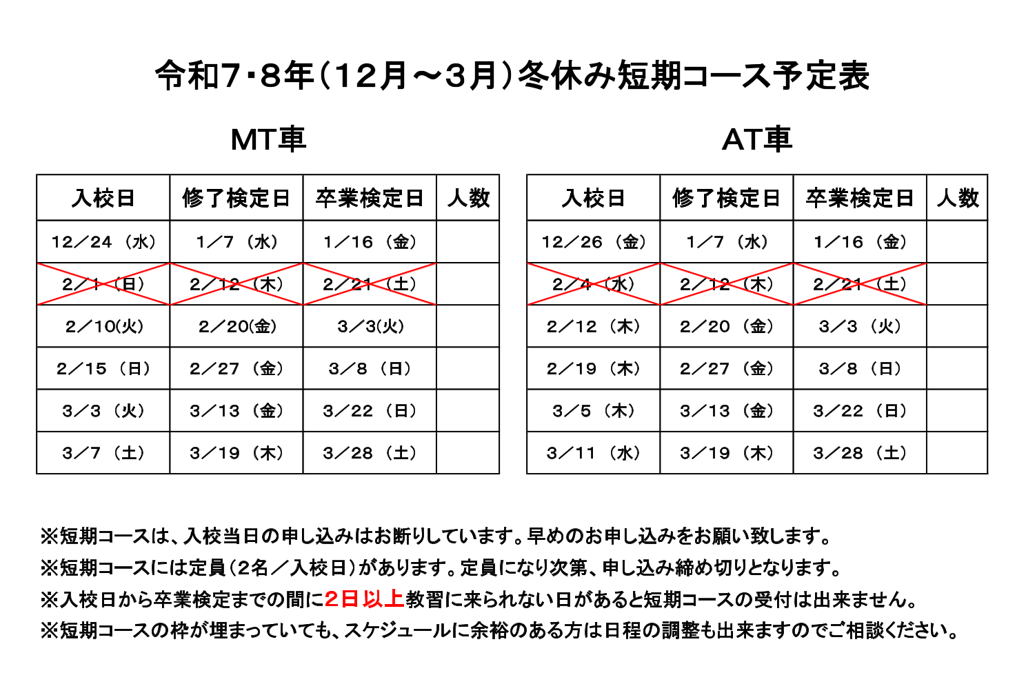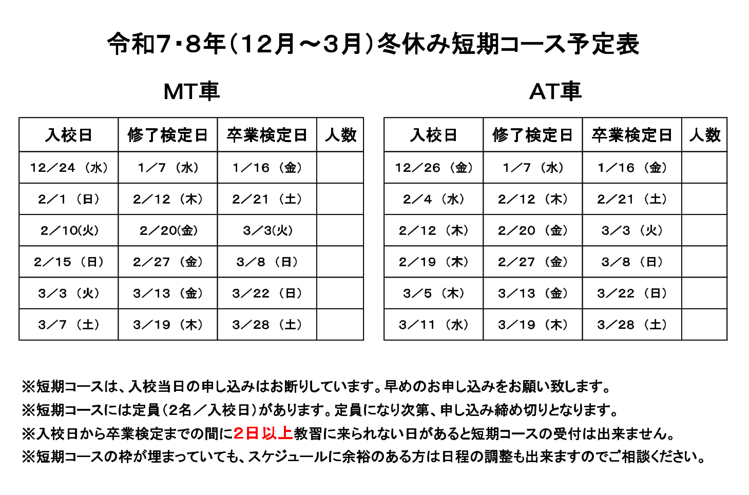 ・7月~9月・12月~3月は大変込み合う時期となっておりますので、お早めの入校をお勧め致します。
