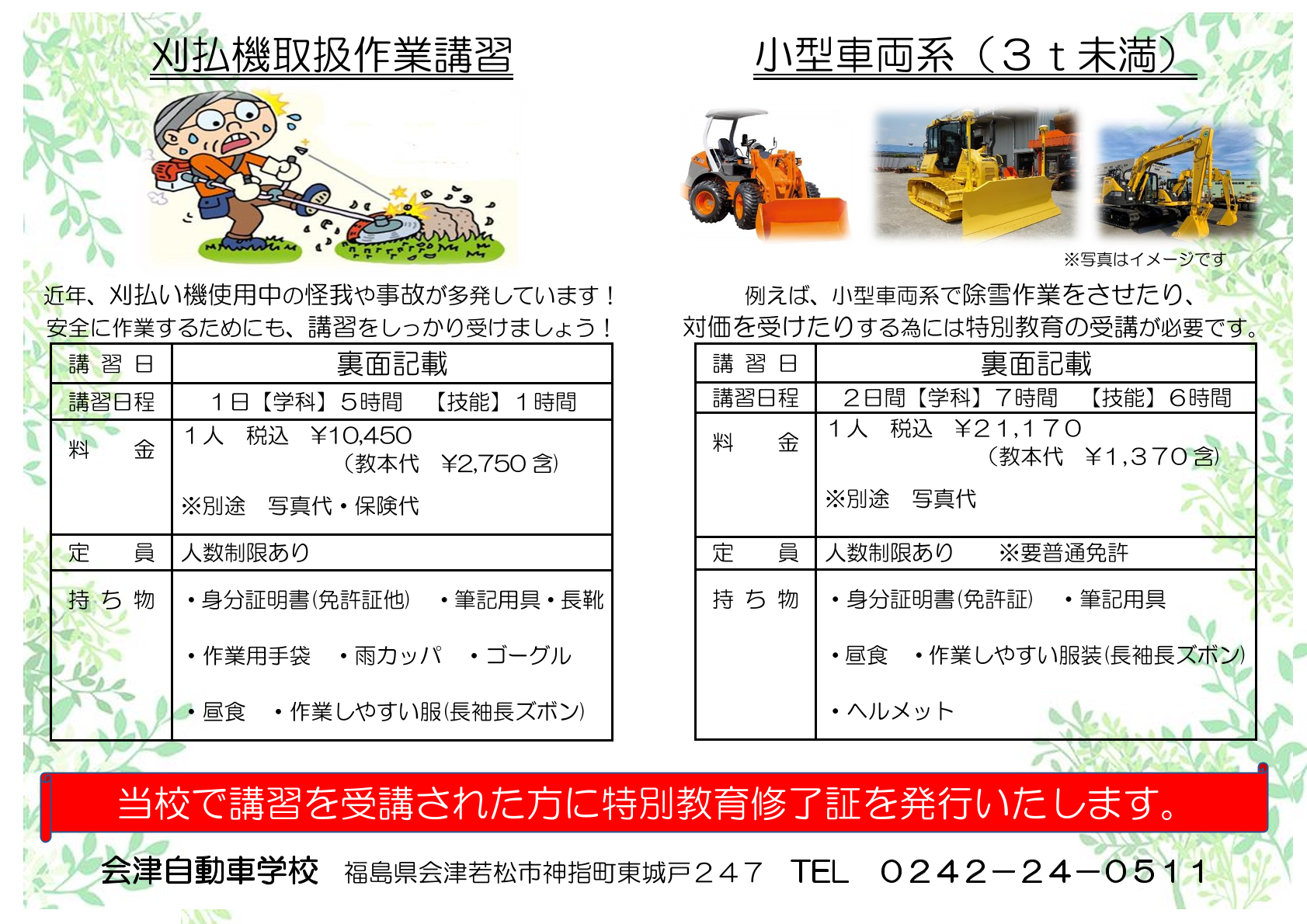 講習料金は当日に頂きますので、詳しくはお申し込みの際にご説明させていただきます。