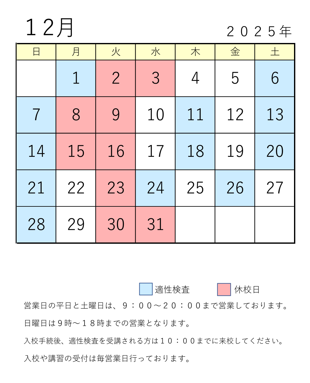 その際は10時まで来校下さい。(適性検査は下記のカレンダーから確認できます)