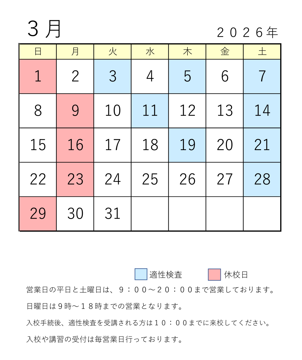 ※学生さんの休み期間は適性検査受講希望者がいない場合、実施しませんので受講希望の方は2日前までに ご連絡下さい。